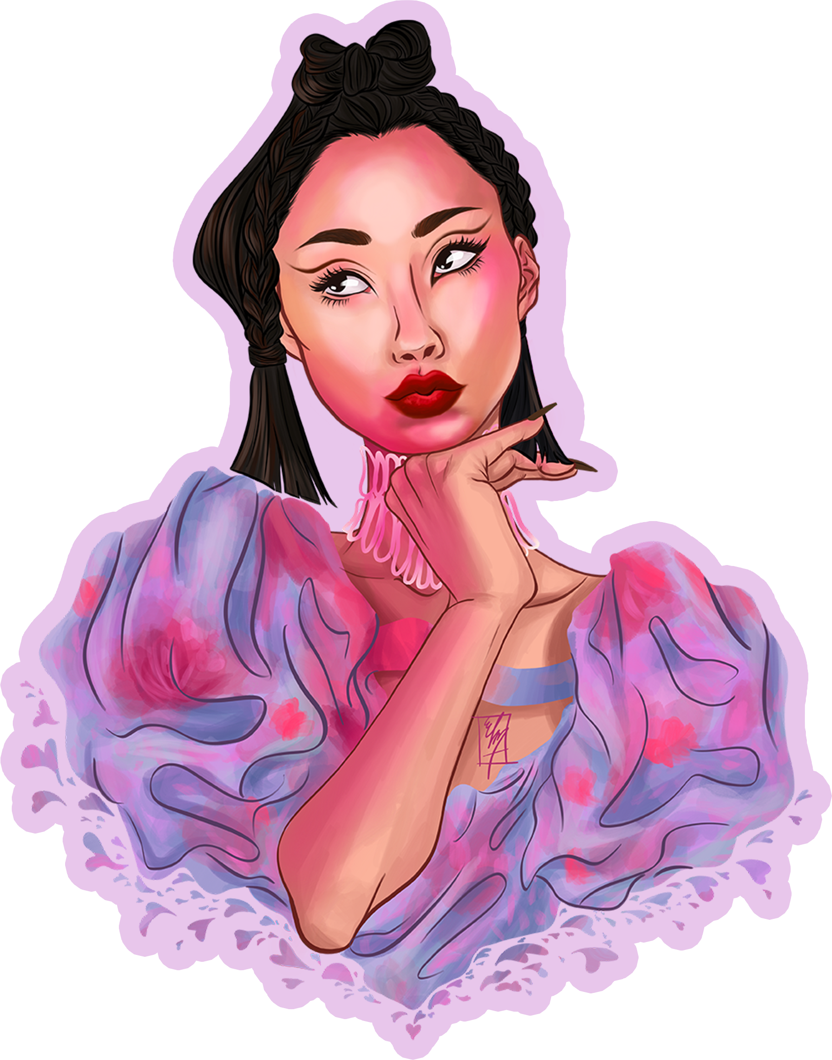 A great stylized and hand-illustrated sticker of Rina Sawayama from her single cover of LUICD that is perfect for laptops, water bottles, and anything else you can think of! All designs are hand-drawn by me! She is 4.1" x 3.2" inches.